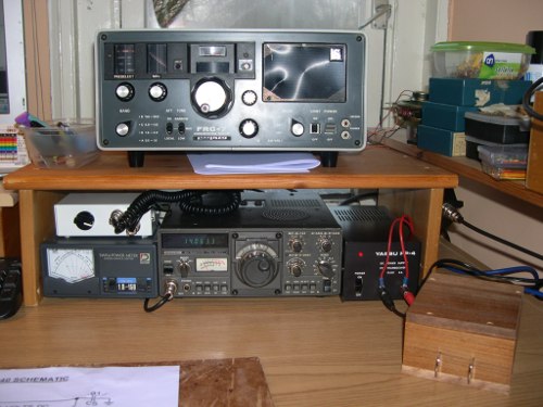 Still the same old radio's: the Kenwood TS-130V and the FRG-7 from Yaesu. A Daiwa SWR meter and switchbox for the microphone. Also a coax switch so I can use the inverted-V's with both radio's.