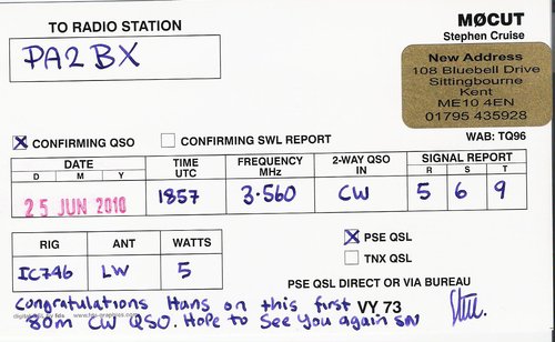 CWEven though there is no morse code proficiency required anymore in the Netherlands it is still fun to learn morse code. I learned it during the first half of 2010 and made some QSOs locally on 10 meter. But when I heard M0CUT calling out on 3560 kHz, in a QRS fashion, I decided to take the plunge. Wrong!!! 3560 is the QRP frequency and Steve was fading fast and picking up speed. Nevertheless, we had a QSO and he was so nice to QSL me with a card.