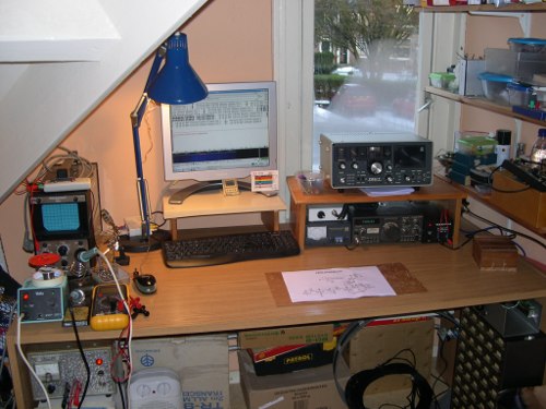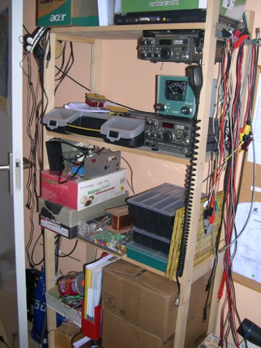 ....shack!!! Well, not really, but I put in a new shelf, finished the touch paddle with keyer and I've got a oscilloscope now. Below the desk lots of boxes, coax cable and drawers with capacitors. As you can see it was damp and it had snowed. When you turn 270 degrees you see.....